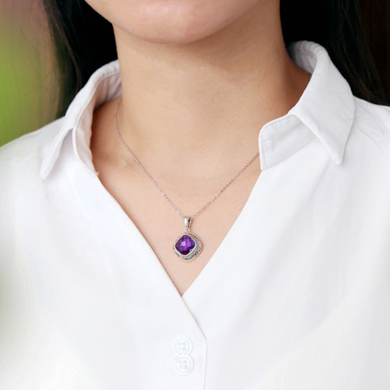 Make a bold statement with the distinctive diamond-shaped pendant, showcasing the natural beauty of the amethyst gemstone.